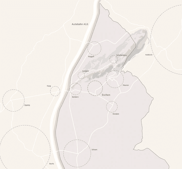 Eschen liegt Zentral im Unterland und bietet somit eine attraktive Lage, sich komfortabel fortzubewegen. Gut ausgebaute Verkehrsadern und Busanbindungen bringen Sie zu Ihren gewünschten Destinationen.